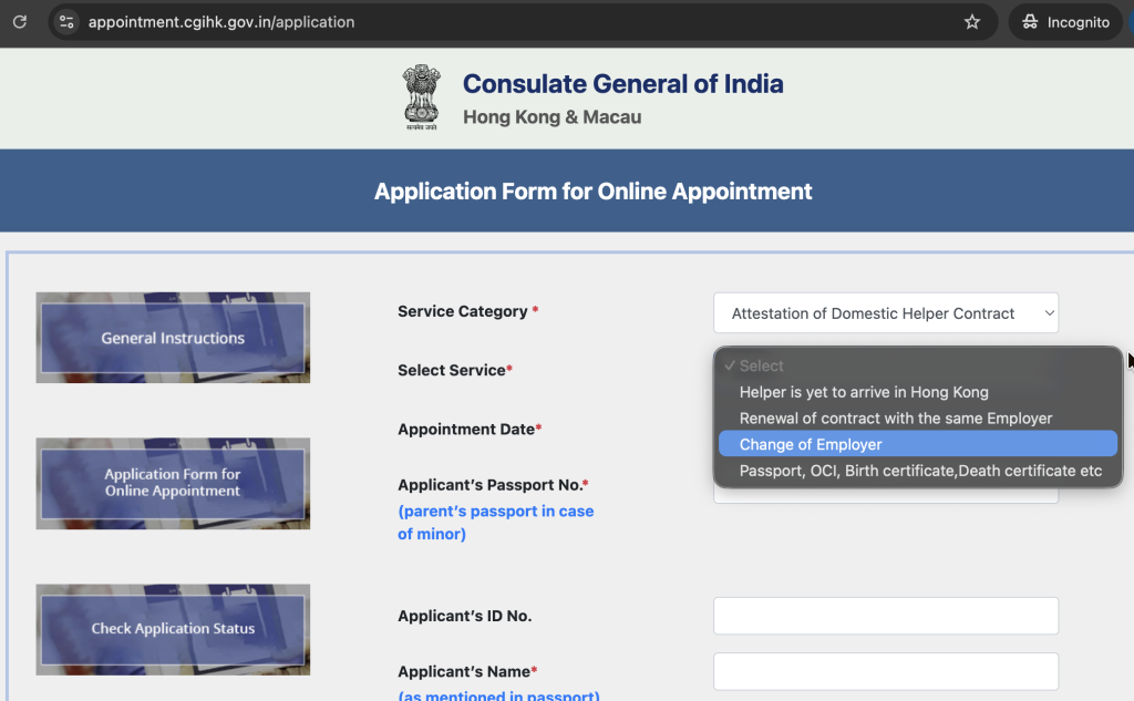 Select Category: Choose “Attestation of Domestic Helper Contract“ or specifically “Change of Employer” for change of employer.